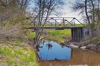 In the era before standard bridge designs were drafted by the Michigan State Highway Department, local road commissions were tempted to reduce costs by using lighter two-angle superstructure elements, as in this bridge. This bridge was built in 1914 by the Minneapolis Bridge Company, likely at the behest of the Bruce Township Board. It is the only example of this type of two-angle superstructure truss bridge in Michigan that has been definitively dated.[2]