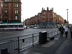 Parkhead Cross is a major road junction which is the meeting point of Gallowgate, Duke Street, Westmuir Street, Tollcross Road and Burgher Street,[3] which together form a turreted Edwardian five-way junction, including several fine buildings making the junction notable, such as the former Glasgow Savings Bank. The junction, which also incorporates the northern termination of the major Springfield Road thoroughfare, can become very busy due to traffic for football games at nearby Celtic Park.