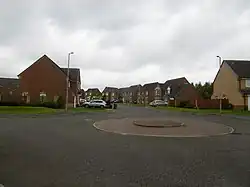 On the northern side of Parkhouse Road is South Nitshill, a 1950s council housing scheme which was almost entirely redeveloped in the early 21st century, so that its new homes were constructed more recently than many of those in the more recently established Parkhouse; however in the 2010s Parkhouse was extended with a sizeable private housing development, street names of which are all prefixed with 'Park' - Parkdale, Parkholm, Parkmanor and Parkmeadow.[6] At the eastern end of the main road (the junction with the major A726 Nitshill Road) is the historic 'category B' Listed Darnley Mill[7][8] which has been converted into a restaurant.[9] Beyond that lies the Darnley district, comprising a residential area with community facilities, a small park and an industrial estate.