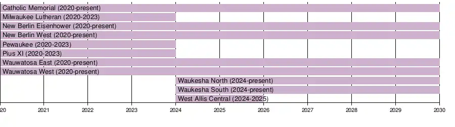 The Parkland Football Conference was founded in February 2019, when the WIAA and the Wisconsin Football Coaches Association released a full realignment package for Wisconsin's high school football conferences to be reviewed on a two-year cycle.[1] An eight-member conference featuring Catholic Memorial in Waukesha, Milwaukee Lutheran, New Berlin Eisenhower, New Berlin West, Pewaukee, Pius XI in Milwaukee, Wauwatosa East and Wauwatosa West was unveiled as part of this realignment.[2] This conference was originally referred to as the Woodland West in preseason realignment materials, as five of the original members were part of the Woodland Conference for all other sports. Instead, it was renamed the Parkland Football Conference after the original Wisconsin high school athletic conference that competed from 1963 to 2006.[3] Membership remained intact for the first four seasons of play before three schools left the conference: Milwaukee Lutheran fully aligned with the Woodland Conference, Pewaukee became football-only members of the Classic 8 Conference and Pius XI joined the Midwest Classic Conference in the large-schools division. Two former Classic 8 members (Waukesha North and Waukesha South) along with West Allis Central (formerly of the Greater Metro Conference) replaced the three outgoing members.[4] For the 2026-2027 cycle, West Allis Central will be exiting to join the Woodland Conference, giving the Parkland Conference seven football members. The Parkland and Woodland Conferences will be entering into a scheduling partnership during this period with one interlocking game per member school that counts in their respective conference standings.[5]