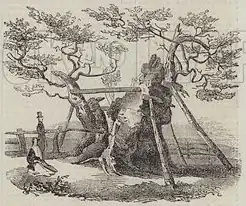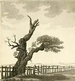 The tree was drawn in 1790, at which point it measured 28 feet 6 inches (8.69 m) in circumference at a height of 1 yard (0.91 m).[2] By 1843 it stood on the Ollerton high road, at a point 4 miles (6.4 km) from Ollerton and on the fringe of what remained of Sherwood Forest. It measured 25 feet (7.6 m) in circumference at a height of 4 feet (1.2 m) from the ground and had a large hollow within it that could accommodate six men.[3] The Parliament Oak was owned at this time by William Bentinck, 4th Duke of Portland who feared it was in danger of dying. He ordered a support framework erected to reinforce the tree against gales. He also planted an acorn within the hollow trunk to grow a replacement.[3]