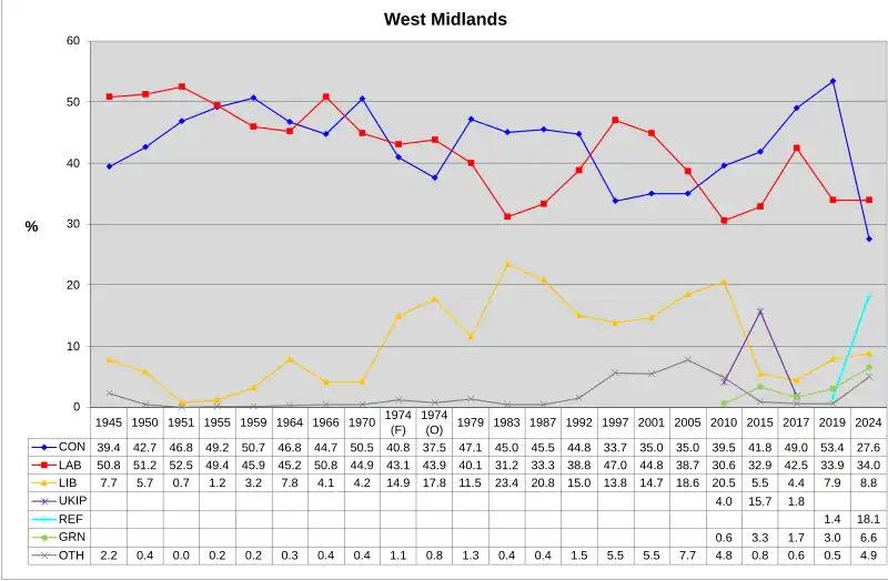 The number of votes cast for each political party who fielded candidates in constituencies comprising the West Midlands region in the 2024 general election were as follows:[5]