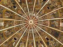 The most striking part of the Baptistery is its painted domed ceiling. The vault is divided into six concentric horizontal bands, with a different series of frescoes in each.[6] The red circle in the middle represents the upper heaven. Sixteen rays come down from the keystone, each corresponding to an arch.[3] The lower part of the interior contains sixteen arches, forming alcoves each containing a painted scene. All these are 13th and 14th century frescoes and paintings, many as ex votos.[5]