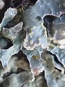 Parmelia sulcata, commonly known as the hammered shield lichen or cracked-shield lichen, is a foliose lichen in the family Parmeliaceae. First described by Thomas Taylor in 1836, it is one of the most prevalent lichen species globally, known for its resilience to pollution and cosmopolitan distribution across temperate and cold regions of both hemispheres. P. sulcata forms a circular thallus up to 10 cm (4 in) in diameter, with a glaucous white to grey upper surface and a black lower surface, featuring broadly lobed structures with both marginal and laminal soralia and a distinctive reticulate pattern of pseudocyphellae.
