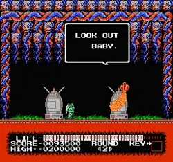 In the latter 2000s, following the release of prototype images, gamers realized that an invisible platform inside the man eating plant's chamber was in fact the "deleted" speaker system, and that programmers had simply covered the sprite in black pixels rather than outright remove it. This led to the establishment of a restoration project, in which gamers began searching through the game's source code in attempt to discover if other "deleted" content had in fact remained on the cartridge, and reinsert it into a "restored" version of the game. The project was completed in 2013.[7] Amongst discoveries made by those working on the project was the revelation that many of the game's more incongruous bosses may have originated as copyrighted characters that had to be altered for the game to be released in the United States: the pumpkin ghost with the spinning head was originally an ape from Planet of the Apes, while the giant cat inside of the box seems to have originally been one of the Gremlins, and finally the grim reaper was originally a robot resembling a Xenomorph from the Alien franchise.