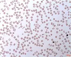 Blood tests in PNH show changes consistent with intravascular hemolytic anemia: low hemoglobin, raised lactate dehydrogenase, raised bilirubin (a breakdown product of hemoglobin), and decreased levels of haptoglobin; there can be raised reticulocytes (immature red cells released by the bone marrow to replace the destroyed cells) if there is no concurrent problem with production of red cells (such as iron deficiency). The direct antiglobulin test (DAT, or direct Coombs' test) is negative, as the hemolysis of PNH is not caused by antibodies.[5] If the PNH occurs in the setting of known (or suspected) aplastic anemia, abnormal white blood cell counts and decreased platelet counts may be seen at this. In this case, anemia may be caused by insufficient red blood cell production in addition to the hemolysis.[5]