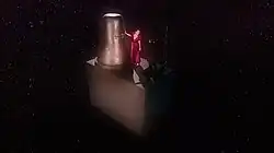 ![]() Special Agent Dale Cooper (Kyle MacLachlan) and Naido (Nae Yuuki) on the top of the structure floating into space. The scene has received critical acclaim, and was compared by many critics to the surreal sequences in Lynch's Eraserhead.[1][2] | |