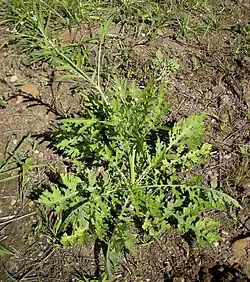 This plant is described as an erect, annual herb with a branched, trichome covered stem that becomes woody with time. It has a deep taproot, and can grow from 1.5 to 2 meters in vertical height especially in good soil. The young plants begin by forming a basal rosette of pale green, dissected, lobed, alternate leaves that can get up to 30 centimeters in length. After stem elongation is initiated, the leaves gradually become smaller.[6] The leaves are said to resemble carrot leaves. The flower heads are a creamy white color, and they protrude from the forks in the leaves.[7] Each bud has about 5 to 8 florets.[8]