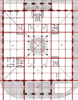 The parti [6] of the Lonja del Comercio building in Havana (in plan) is a perfect square and based on the classic 9 square problem that was used, [1] [7][a] among others, by Peter Eisenman to design some of his houses [2] and Andrea Palladio in the design of many of his villas. [3] [8] [b][9] [4]