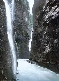 The Partnach Gorge (German: Partnachklamm) is a deep gorge that has been incised by a mountain stream, the Partnach, in the Reintal valley near the south German town of Garmisch-Partenkirchen. The gorge is 702 metres (2,303 ft) long and, in places, over 80 metres (260 ft) deep. It was designated a natural monument in 1912.