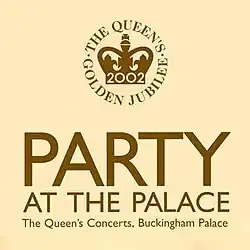 The Party at the Palace was a pop/rock music concert held at Buckingham Palace Garden in London on 3 June 2002. The event was in commemoration of the Golden Jubilee of Queen Elizabeth II held over the Golden Jubilee Weekend.[1] It was the pop/rock equivalent of the Prom at the Palace, that showcased classical music.[1] 10 years later the Diamond Jubilee Concert for the Queen's Diamond Jubilee was held in 2012, followed by the Platinum Party at the Palace for the Queen's Platinum Jubilee in 2022.