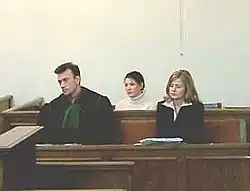 No preventive measure was applied to Nieznalska.[12] The first hearing took place on 16 September 2002.[9] Wojciech Cieślak served as Nieznalska's defense attorney throughout the entire process.[46][b] Witnesses who claimed their religious feelings had been offended were questioned. They admitted, however, that they had not personally seen the exhibition but were familiar with it only from an article in Gazeta Wyborcza and a television report by TVN.[12] The installation, as evidence in the case, was secured by the prosecutor's office. Tomasz Pączek, a private individual, acted as an auxiliary prosecutor.[47] Nieznalska did not admit to committing the alleged acts[12] and consistently maintained throughout the entire process that she did not intend to offend religious feelings.[48]