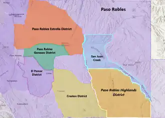 | Other regions in California, Central Coast AVA, San Luis Obispo County, Paso Robles AVA | Adelaida District AVA, Creston District AVA, El Pomar District AVA, Paso Robles Estrella District AVA, Paso Robles Geneseo District AVA,Paso Robles Willow Creek District AVA, San Miguel District AVA, San Juan Creek AVA, Santa Margarita Ranch AVA, Templeton Gap District AVA |
