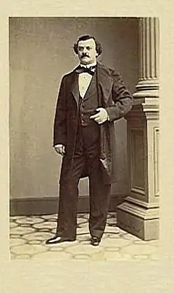 On the invitation of Ole Bull,[1] he came to the United States with Maurice Strakosch in 1855, and soon attained a popularity that lasted almost to the end of his life. His American debut was as Edgardo in Lucia di Lammermoor (12 March 1855)[5] and soon thereafter he sang Manrico in the first American production of Il Trovatore (2 May 1855).[1][5] Other premiere American performances in which he appeared were La Traviata (1856), I vespri siciliani (1859) and Un ballo in maschera (1861), conducted by Brignoli's friend, Emanuele Muzio at the New York Academy of Music,[6] as well as Luigi Arditi's La Spia (1855)[7] and Betly (1861) at the Philadelphia Academy of Music.[1] Brignoli's first appearance in Boston was on May 25, 1855, as Gennaro in Lucrezia Borgia.[5]