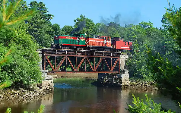![]() A moonlight view of the Passagassawakeag River along the tracks of the Belfast and Moosehead Lake Railroad just beyond the old Upper Bridge a little more than a mile inland from Belfast, ME, where it empties into Belfast Bay. | |