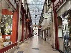 Although cut into two parts by the Rue Édouard-Herriot under the Second Empire, the passage has retained its character.[21] The four main entrances are in neo-classical style; the passageway is roofed in glass with central suspended lanterns. Shop-fronts are wood and are voluntarily kept similar in appearance.[20] There are a variety of shops, most selling luxury goods, including watches, pipes, clothing accessories, home decor, and gifts.