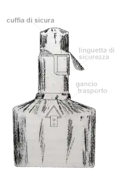 The bomb consisted of a block of explosive, into which was inserted a metal tube of about 7 cm containing an OTO Mod. 35 hand grenade (known to the British as the "Red Devil") to serve as a detonator. The whole assembly was then covered with a canvas bag fitted with a transport hook.