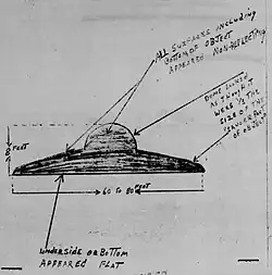 Riley recalled that the object was heading southeast as a "leisurely pace" before coming to a halt and hovering overhead. Riley claimed "It was so near, it could have been hit with a rifle". He described the object as 30 feet (9.1 m) wide and estimated it was hovering at 200 feet (61 m).[12] He described the object as silent.[12] Riley claimed the object tilted as it began moving towards the southwest, ultimately travelling out of sight.[12]