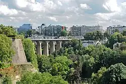The Passerelle, also known as the Luxembourg Viaduct, is a viaduct in Luxembourg City, in southern Luxembourg. Nowadays it runs from the south into the city centre, Ville Haute, carrying road traffic across the Pétrusse valley and connecting Avenue de la Gare to Boulevard Franklin Delano Roosevelt. It is 290 m long, with 24 arches, and 45 m above the valley floor.