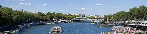The Passerelle Debilly (French pronunciation: [pasʁɛl dəbili], 'Debilly Footbridge') is a through arch bridge in Paris spanning the Seine. It is a footbridge that connects the quai de New York to the quai Branly, close to the Eiffel Tower.