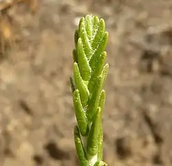 Members of the genus Passerina are ericoid shrubs or shrublets, often with a tendency to having pendulous branches. Their leaves are markedly decussate. They are concave or closely involute, lined with woolly hairs, and cling to leafy stems without being large enough to cover them. This gives the plants a characteristic plaited or corded appearance.[3]