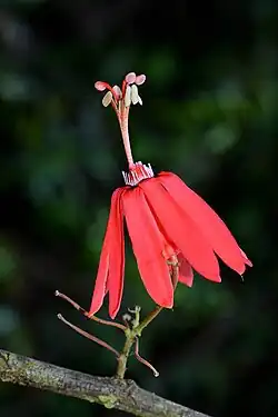Passiflora glandulosa have cauliflorous inflorescence, meaning the flowers grow directly from the plant's woody stems instead of from new shoots.[5] Its petals are red or scarlet in color. The filament has both an external and internal component: the internal region ranges from 2–5 mm (0.079–0.197 in) long and is attached at its base. On the other hand, the external filament is awl-shaped and 100 mm (3.9 in) long, with a white to slightly pink color.[4] As depicted below, fruit of the wild passion fruit has an ovoid shape. Fruits are high in vitamin C.[6] As an indehiscent fruit, seeds are normally contained within the fruit unless disturbed by predation or decomposition.[2] Passiflora glandulosa seeds are typically 4 mm × 8 mm (0.16 in × 0.31 in), obovate in shape, and reticulated.[4]