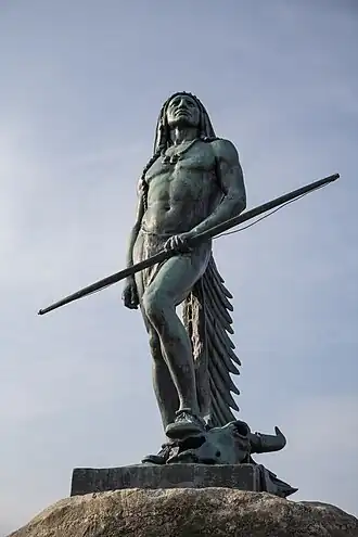 The sculpture depicts a male figure clad in a breach cloth and a full-length war bonnet standing in the contrapposto position. His left hand holds a bow and his left foot rests upon a bison skull. The sculpture is placed atop a granite bolder, which is located in a traffic rotary at the intersection of Walnut and Seymor Streets. The sculpture is within sight of the only full-sized copy of Dallin's Appeal to the Great Spirit sculpture that is down the street. The original Appeal to the Great Spirit is a landmark piece in front of Boston's Museum of Fine Arts.
