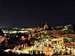 The Passion of the Christ is performed every year during Easter, in a purpose-built 100,000-square-metre (1,100,000 sq ft) theatre-city in the arid backlands of Pernambuco, in northeastern Brazil. It is considered to be the largest open-air theatre in the world.[21] Thousands of visitors arrive every year to watch the performance; over 500 actors appear on the nine separate stages within the stone walls of the New Jerusalem city-theatre, founded in 1968.[22][23] 2.2 miles of walls and 70 towers flank the outer perimeter of the New Jerusalem Theater. The first passion play in the town took place in 1951, and consisted only of a few family and friends playing all of the roles. In 1963, the townspeople began constructing a replica Jerusalem in Brejo da Madre de Deus.[24] The nine separate stages include The Upper Room, the Roman Forum, Herod's palace, Bethesda Lake and the Sepulcher. During 8 performances during the Holy Week, an average of 8,000 people per show from around the globe follow the actors as they move through "ancient Jerusalem", portraying every step of the Passion of Christ.[25][26] In the 2010 season, when the 43rd anniversary of the Passion of Christ in Nova Jerusalem was celebrated, the public reached a record 80,000 people, coming from 22 Brazilian states and 12 countries.[27][28]