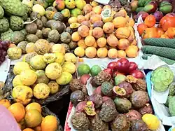 The passion fruit (Portuguese: maracujá and Spanish: maracuyá, both from the Tupi mara kuya, lit. "fruit that serves itself" or "food in a cuia") and granadilla is the fruit of several plants in the genus Passiflora.[1][2] It is native to subtropical regions of South America from southern Brazil through Paraguay to northern Argentina.[1] The fruit is eaten for its pulp and seeds, and as a juice. The name passion fruit derives from 18th century Christian missionaries who interpreted the flower as a religious symbol.[3]
