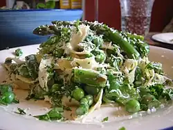Pasta primavera (lit. 'spring pasta') is an Italian-American dish that consists of pasta in a cream sauce and fresh vegetables, invented in the 1970s.[1][2]