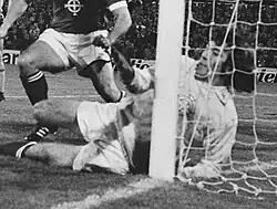Jennings spent thirteen years at White Hart Lane, where he played in 472 league games for Spurs, and 591 in all competitions. He won the FA Cup in 1967, the League Cup in 1971 and 1973, and the UEFA Cup in 1972.[8] He also scored once, in the 1967 Charity Shield, from his own area, kicking the ball from his hands and sending a large punt down the field that bounced over Manchester United goalkeeper Alex Stepney and into the net.[9] In 1973 the Football Writers' Association named him as its footballer of the year.[10] Three years later he won PFA's version of the award – he was the first goalkeeper to receive this accolade, and to this date remains only one of two, along with Peter Shilton.[11]