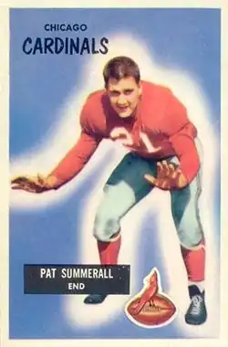 Summerall spent ten years as a professional football player in the National Football League, primarily as a placekicker. The Detroit Lions drafted Summerall as a fourth-round draft choice in the 1952 NFL draft.[6] Summerall played the pre-season with the Lions before breaking his arm, which ended the year for him.[7] After that season, he was traded and went on to play for the Chicago Cardinals from 1953 to 1957 and the New York Giants from 1958 to 1961, during which he was a part of The Greatest Game Ever Played. His best professional year statistically was 1959, when Summerall scored 90 points on 30-for-30 (100%) extra-point kicking and 20-for-29 (69%) field goal kicking.
