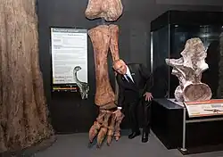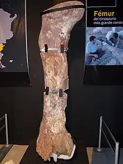 Skeletal mounts based on all available material of Patagotitan are displayed in multiple museums. Research Casting International digitally scanned the specimens, which was followed by the creation of foam molds, fiberglass casts, and 3D printing. One mount is exhibited in the Museum of Paleontology Egidio Feruglio. Another is exhibited in the American Museum of Natural History, where it replaced a juvenile Barosaurus mount.[3] Some of the original fossils, including a femur, were also on display briefly.[4][5] One is exhibited in the Field Museum of Natural History, where it replaced the Sue specimen of Tyrannosaurus (which has been moved to another exhibit).[6] From March 2023 until January 2024, one will be displayed at the Natural History Museum, London.[7][8]