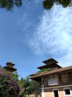 The temple was built in 1667 by King Siddhi Narsingh Malla.[13] It is said that one night the King saw Lord Krishna and his consort Srimati Radha standing in front of the royal palace. He ordered a temple to be built on the same spot.[14] There are 21 golden pinnacles in the temple. Below the pinnacles are three stories. The first floor holds the main shrine of Lord Krishna with shrines of Radha and Rukmini at each side. The second floor is dedicated to Lord Shiva and the third to Lokeshwor (Avalokiteshvara).[1][14]