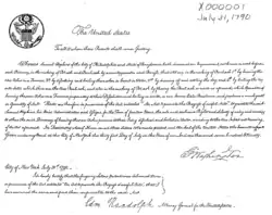 The origins of the 1790 Patent Act can be found in House Resolution 41, which brought about a discussion concerning the constitutionality of authorizing patents of importation. House Resolution 41 is the reason for why the Patent Act of 1790 did not provide for patents of importation when it was finally passed.[3] Patent Board members, who also called themselves the "Commissioners for the Promotion of Useful Arts",[4] were given the authority to grant or refuse a patent after deciding if the invention or discovery was "sufficiently useful and important."[5] The first board members included Thomas Jefferson, Henry Knox, and Edmund Randolph. Obtaining a patent required an overall fee of about four to five dollars:filing the application cost fifty cents plus ten cents per hundred words of specification: two dollars for producing the actual patent, one dollar for affixing the Great Seal and twenty cents for endorsement and all other services.[4] The duration of each patent was assigned by the Patent Board, and could be of any length as long as it did not exceed fourteen years.[1]