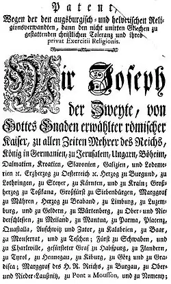 The Patent of Toleration (German: Toleranzpatent, Hungarian: Türelmi rendelet) was an edict of toleration issued on 13 October 1781 by the Habsburg emperor Joseph II.[1][2] Part of the Josephinist reforms, the Patent extended religious freedom to non-Catholic Christians living in the crown lands of the Habsburg monarchy, including Lutherans, Calvinists, and the Eastern Orthodox.[3][4] Specifically, these members of minority faiths were now legally permitted to hold "private religious exercises" in clandestine churches.[5]