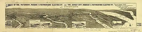 The Paterson, Passaic and Rutherford Electric Railway was a trolley line of 40.57 miles in track length incorporated in 1893 as a consolidation of Paterson & Little Falls Electric Railway Co., Grant Street Electric Railway Co., People's Park Railway Co., Paterson & Passaic Electric Railway Co. and Passaic, Rutherford & Carlstadt Electric Railway Co. located in northern New Jersey, the company was leased from 1894–1899 to the New Jersey Electric Railway Co.[1]