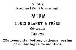 On October 10, 1892 Louis Brand & Fils, run by Louis Paul and César Brandt registered the name 'Patria' with the description, "Mouvements, boites, cadrans, ecrins et emballages de montres". Translated to English, this means "Movements, cases, dials, watch boxes and watch packaging.[1] The name 'Patria' is from the latin word for "Fatherland" or "Homeland", cognate with Ancient Greek πατριά (patriá, “generation, ancestry, descent, tribe, family”) and πατρίς (patrís, "place of one's ancestors").