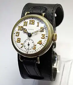 When the First World War broke out in 1914, a tactic known as the creeping artillery barrage was frequently used. This involved artillery fire moving forward in stages just ahead of the advancing infantry and required perfect timing to avoid friendly fire.[7] As a result of this, a quarter of all soldiers were wearing wristwatches by 1916.[8] In 1917, the War Office began issuing wristwatches to all soldiers. A great number of the watches issued to the men fighting in the trenches were Patria trench watches.[9]