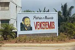 The origin of the motto was derived from a speech by revolutionary leader Fidel Castro to commemorate the workers and soldiers who died in the La Coubre explosion on March 5, 1960 at the harbour in Havana.[1] The motto was originally written as Patria o Muerte ("Homeland or death"), with the word Venceremos ("we will prevail") added in July 1960 during the Congress of the National Federation of Barber and Hairdressing Workers. In a 1964 speech at the United Nations, Che Guevara used the iconic phrase to communicate Cuba's new stance against the harassment of the U.S. government. The phrase has recently been adapted by some Cuban musicians and protestors to now say, "Patria y vida" ("Homeland and life").[2]