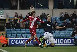 On 3 April, Bamford sent Middlesbrough to the top of the Championship table by scoring his 17th goal of the season in a 1–0 win against Wigan Athletic.[47] On 11 April, he scored his 18th goal of the season against Rotherham United, but did miss a penalty during stoppage-time after fighting it over with fellow striker Kike who won the penalty originally. Later on, Bamford revealed that he was the designated penalty-taker and apologised to his teammate for missing the penalty.[48] Also that month, he was nominated at the Football League Awards for Championship Player of the Year and Young Player of the Year.[49] He won the first award, with the second going to Dele Alli of Milton Keynes Dons.[50]