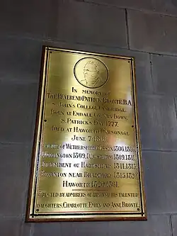 In December 1809, Patrick Brontë moved to the West Riding of Yorkshire as a curate at All Saints, Dewsbury (now Dewsbury Minster). The area was undergoing an evangelical revival under the incumbent vicar John Buckworth. Brontë taught reading and writing at Dewsbury's Sunday School and was deputised by Buckworth to attend twice weekly meetings of the Church Mission Society on his behalf. A memorial plaque to Brontë can be found on the South Aisle of Dewsbury Minster.[18]