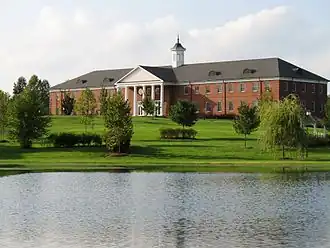 Patrick Henry College is located in the town of Purcellville in rural northern Virginia, approximately 40 miles (64 km) northwest of Washington, D.C. The campus currently consists of seven buildings arranged around a retention pond popularly called "Lake Bob",[22] as well as several athletic fields. The oldest structure, Founders Hall, opened in 2000 and contains three classrooms, the college library, and various administrative and faculty offices. It is also home to the offices of the Home School Legal Defense Association.[23] Hanna Rosin, author of God's Harvard, described the campus as "tiny, less like an Ivy League college than like a Hollywood set of an old Ivy League school." The buildings are of Colonial Revival architecture. The artwork in Founders Hall consists of copies of portraits of the Founding Fathers placed along a staircase, leading to a picture of Patrick Henry at the second Virginia convention which features a light from heaven guiding Henry's speech. The artwork is designed to, in the words of Hanna Rosin, "remind the students that America was founded as a Christian nation."[24]