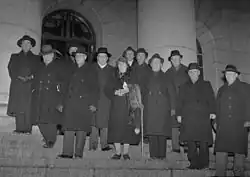 IKL kept its 14 seats in the elections of 1936 but was weakened by the overwhelming victory for the coming social democrat-agrarian coalition, under Prime Minister Aimo Kaarlo Cajander that would replace in the spring of 1937 the centrist minority government of Kyösti Kallio, which had, in turn, replaced the narrow right-wing minority government of Toivo Mikael Kivimäki.[14] The strong new government soon moved against the IKL, with Urho Kekkonen, then Minister of the Interior, bringing legal proceedings against the movement late in 1938. However, the courts did not find sufficient grounds for banning IKL.[15] Despite this the prosperity experienced under Cajander's government hit the IKL and in the 1939 elections they managed only eight seats.[16] Kekkonen was one of two leading government opponents of the IKL who would later go on to serve as presidents of Finland, the other being Juho Kusti Paasikivi.