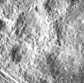This is a heavily damaged crater that now appears as little more than an irregular depression in the surface. Both the outer rim and interior floor are streaked by jumbled ridges of material that are radial to Tsiolkovskiy. Most likely this is ejecta deposited during Tsiolkovskiy's formation.