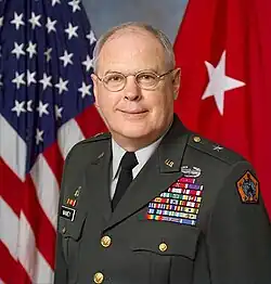 Patt Maney was one of seven children born to parents Charles Thomas Maney and Mary Bewlay Steele Maney.[1][2] Born in Lexington, Kentucky, Maney attended the University of Kentucky in his hometown where he was a member of the Reserve Officers' Training Corps program.[3] Maney completed his undergraduate education in 1970,[3] and pursued legal studies at the University of Louisville School of Law. He formally joined the United States Army in 1970,[4] and obtained his degree in law in 1974.[5] While serving in the military, Maney also studied at the Army War College, graduating in 1989.[6] He served during Operation Just Cause in Panama, Operation Uphold Democracy in Haiti, as well as Operations Joint Guard and Joint Endeavor in Bosnia.[3] Maney was injured by an improvised explosive device in August 2005, while in Afghanistan as a part of Operation Enduring Freedom.[3][5] The explosion tore cartilage in both shoulders, sprained his knees, broke his nose, cracked 27 of his teeth, and caused a traumatic brain injury.[7][8] He spent twenty months in recovery at the Walter Reed Army Medical Center, and subsequently ended his military career in April 2007, having served nearly 37 years in the army and advancing to the rank of brigadier general.[3][4] The University of Kentucky awarded Maney an honorary doctorate in law in 2016.[9]