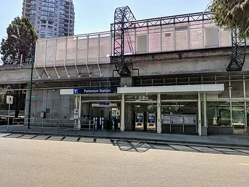 Patterson is an elevated station on the Expo Line of Metro Vancouver's SkyTrain rapid transit system. The station is located at the intersection of Central Boulevard and Patterson Avenue in Burnaby, British Columbia, Canada. It is the westernmost Expo Line station in Burnaby.