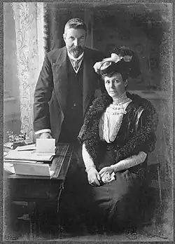 Browne first met her future husband Alfred Deakin in 1874, when she was 11 and he was 17. They were both attendees at the Melbourne Progressive Lyceum, the Sunday school for the city's Spiritualists.[4] In July 1877, Alfred became her class teacher; he was also the conductor of the school band. He participated in a number of her séances.[6] They danced for the first time at her coming-out ball the day before her 16th birthday.[7] In 1879, both were elected "leaders" of the Lyceum.[8] He began seriously courting her after her 18th birthday in 1881,[9] and proposed marriage in July. Her father gave only qualified approval, concerned about Alfred's social standing and lack of independent means.[10] According to family tradition, Pattie had also been courted by a wealthy 40-year-old baronet.[11]
