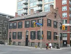 The Paul Bishop's House is actually a pair of historic townhouses located at 363-365 Adelaide Street East in the St. Lawrence neighborhood downtown Toronto, Ontario, Canada. The houses, constructed in 1848 by Paul Bishop, sit upon the foundations laid by William Jarvis for his home in 1798. Jarvis was a member of the Queen's Rifles and Provincial Secretary and Registrar of Upper Canada. He selected a site at what is now the southeast corner of Sherbourne and Adelaide Streets and constructed a 30 by 41 foot building of squared logs that he covered with clapboards which he named Jarvis House.