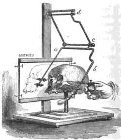 Broca is known for making contributions towards anthropometry—the scientific approach to measurements of human physical features. He developed numerous instruments and data points that were the basis of current methods of medical and archeological craniometry. Specifically, cranial points like glabella and inion and instruments like craniograph and stereograph.[54] Unlike Morton, who believed that a subject's brain size was the main indicator of intelligence, Broca thought that there were other factors that were more important. These included prognathic facial angles, with closer to right angles indicating higher intelligence, and the cephalic index relationship between the brain's length and width, that was directly proportional with intelligence, with the most intelligent European group being 'long headed', while the least intelligent Negro group being 'short headed'.[55] He thought that the most important aspect, was the relative size between the frontal and rear areas of the brain, with Caucasians having a larger frontal area than Negroes.[55] Broca eventually came to the conclusion that larger skulls were not associated with higher intelligence, but still believed brain size was important in some aspects such as social progress, material security, and education.[56][n 6] He compared cranial capacity of different types of Parisian skulls. In doing so he found that the average oldest Parisian skull was smaller than a modern, wealthier Parisian skull and that both were bigger than the average skull from a poor Parisian's grave.[n 7] Aside from his approaches to craniometry, Broca made other contributions to anthropometry, such as developing field work scales and measuring techniques for classifying eye, skin, and hair color, designed to resist water and sunlight damage.[60]